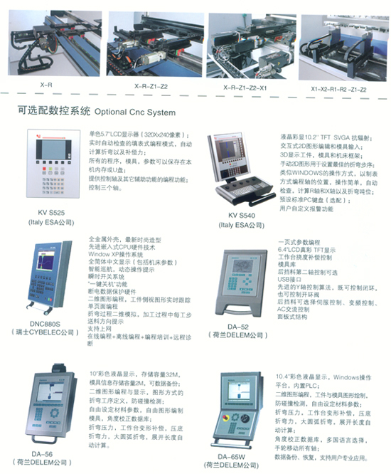 可選擇配置數(shù)控軸: 1、后擋料定位(X軸); 2、后擋料高度調(diào)節(jié)(R軸); 3、擋料塊獨立的橫向調(diào)節(jié)(Z軸); 4、工作臺加凸(V軸); 5、每個擋料塊X向獨立運動(X‘軸)(適用于公稱力為2500KN以下規(guī)格)。
