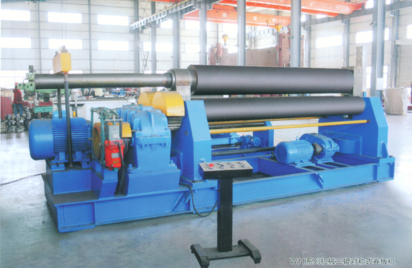 性能特點: 本機結構型式為三輥對稱式,上輥在兩下輥中央對稱位置作垂直升降運動,通過絲桿絲母蝸桿傳動而獲得,兩個輥作旋轉運動,通過減速機的輸出齒輪與下輥齒輪嚙合,為卷制板材提供扭矩。本機床結構緊湊,操作維修方便。